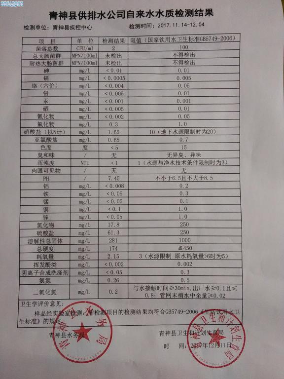 2017年青神县第四季度自来水水质检测结果